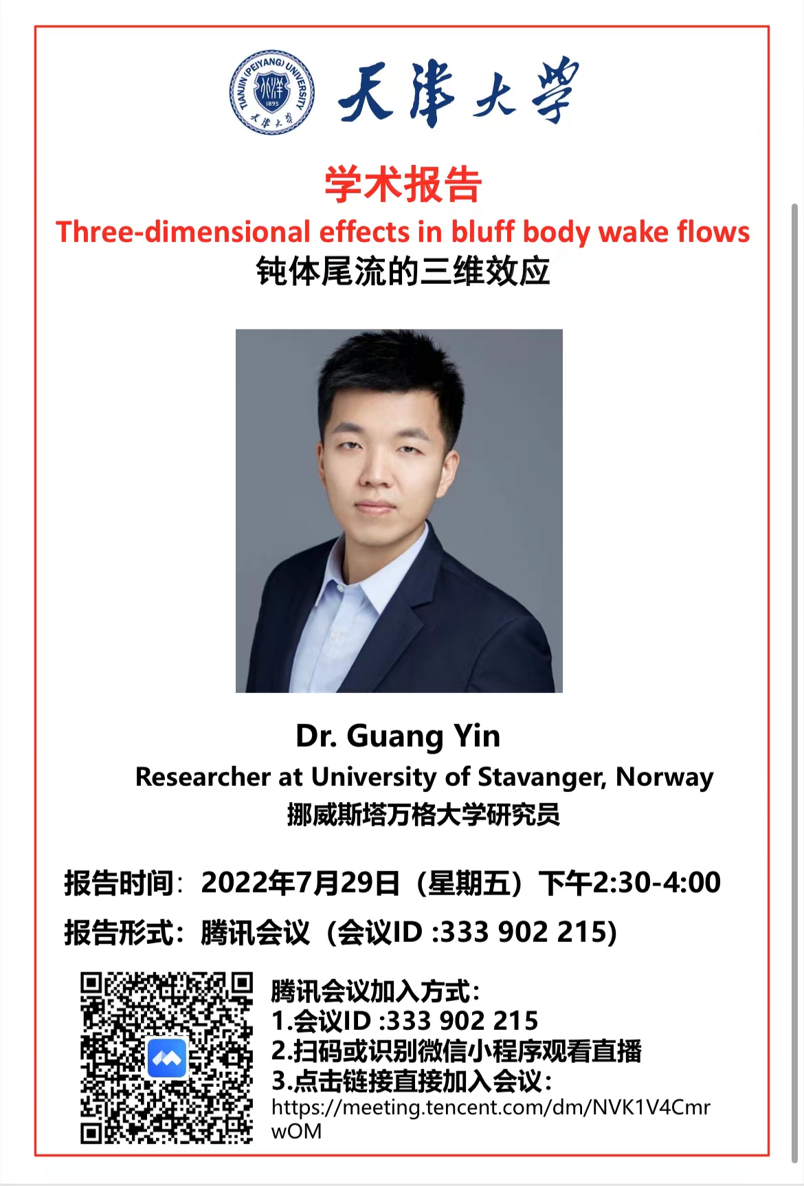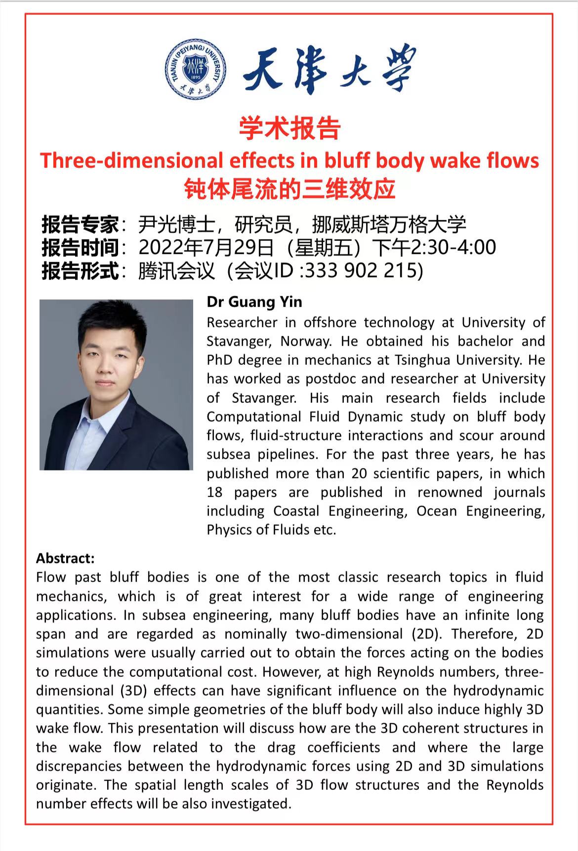 2022年7月29日下午2:30-4:00,挪威斯塔万格大学尹光老师将带来在线学术讲座,主题为钝体尾流的三维效应,腾讯会议号:330902215,会议链接如下//meeting.tencent.com/dm/NVK1V4CmrwOM,诚邀各位老师和同学参加。