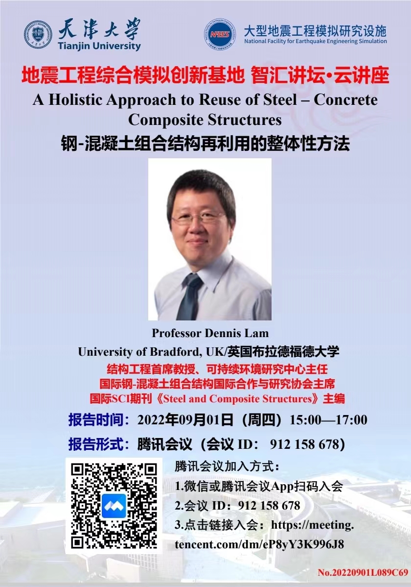 2022年9月1日15:00—17:00,国际SCI期刊《Steel and Composite Structures》主编、英国布拉德福德大学首席教授 Dennis Lam 将通过“云端”为大家带来关于“A Holistic Approach to Reuse of Steel – Concrete Composite Structures/钢-混凝土组合结构再利用的整体性方法”方面的讲座和交流,腾讯会议号:912 158 678。具体报告信息请查阅海报,诚邀各位老师和同学参加。