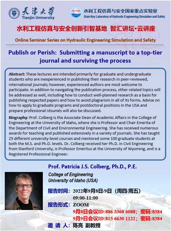 2022年9月8日和9日(周四和周五)上午9:00-11:00,美国爱达荷大学(The University of Idaho)工程九游 主管学术副院长Patricia J.S. Colberg教授将通过“云端”为大家带来“Publish or Perish: Submitting a manuscript to a top-tier journal and surviving the process/接收或拒稿:向顶级期刊投稿并发表”的学术报告,ZOOM会议:9月8日ID886 3368 6088(密码:8384)、9月9日ID815 6630 1122(密码:8384)。以下是海报信息,诚邀各位老师和同学参加。