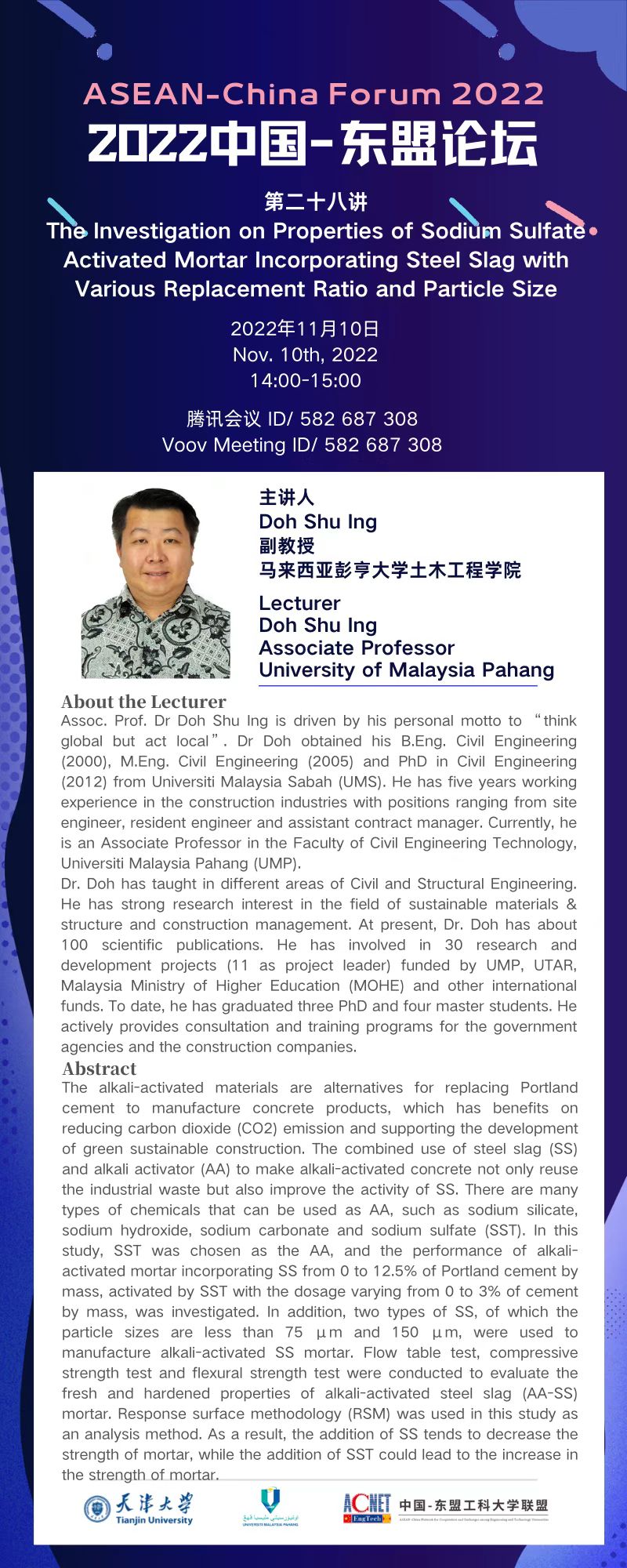 一.2022年11月10日(周四)下午2:00-3:00,主讲人:彭亨大学Doh Shu Ing老师,主题:The Investigation on Properties of Sodium Sulfate Activated Mortar Incorporating Steel Slag with Various Replacement Ratio and Particle Size,腾讯会议号:582687308。