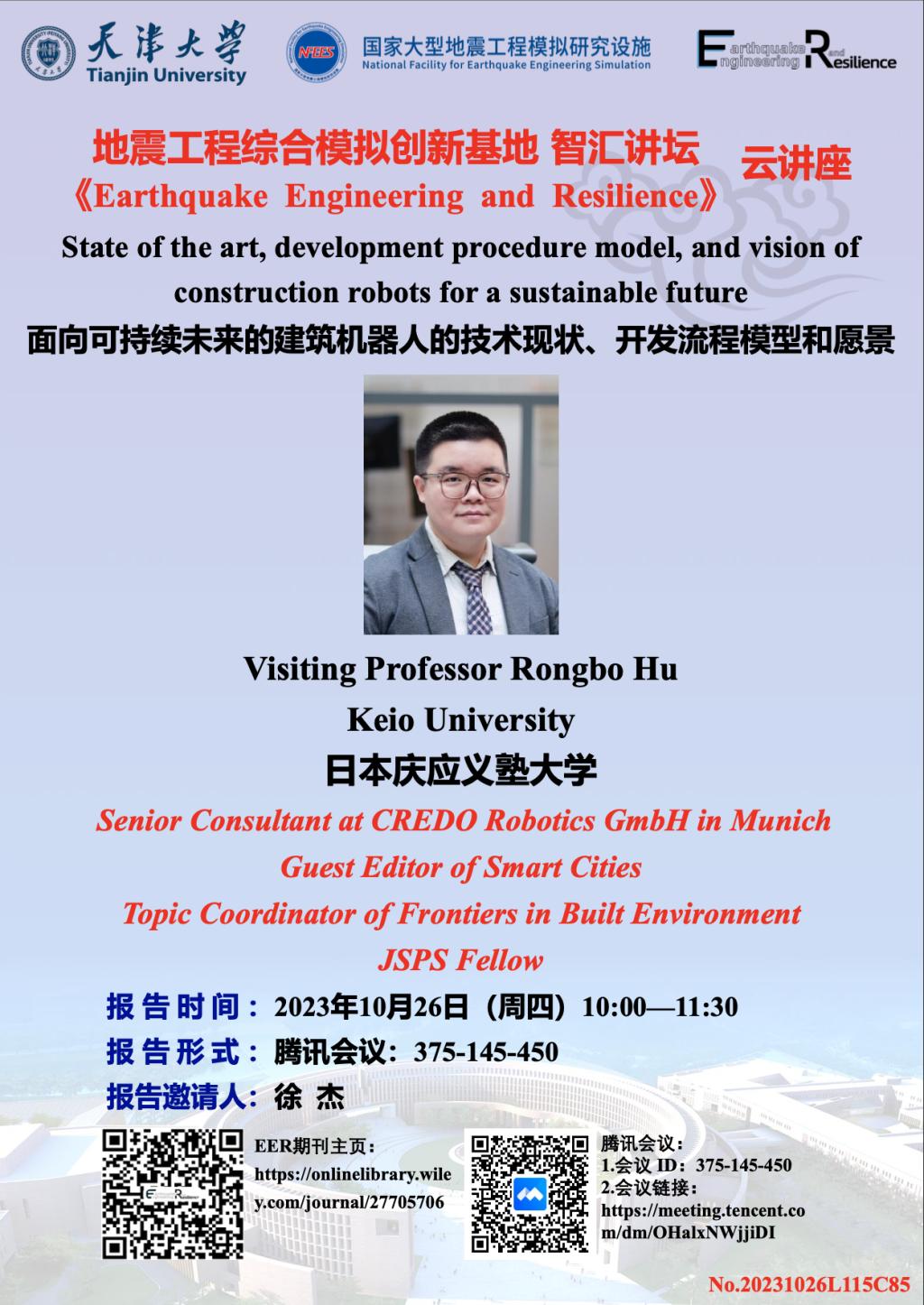 2023年10月26日上午10:00—11:30,日本庆应义塾大学Rongbo Hu客座教授将在线上为大家带来关于“State of the art, development procedure model, and vision of construction robots for a sustainable future/面向可持续未来的建筑机器人的技术现状、开发流程模型和愿景”方面的讲座和交流,腾讯会议号:375-145-450,具体时间和安排见海报,诚邀各位感兴趣的老师和同学参加。