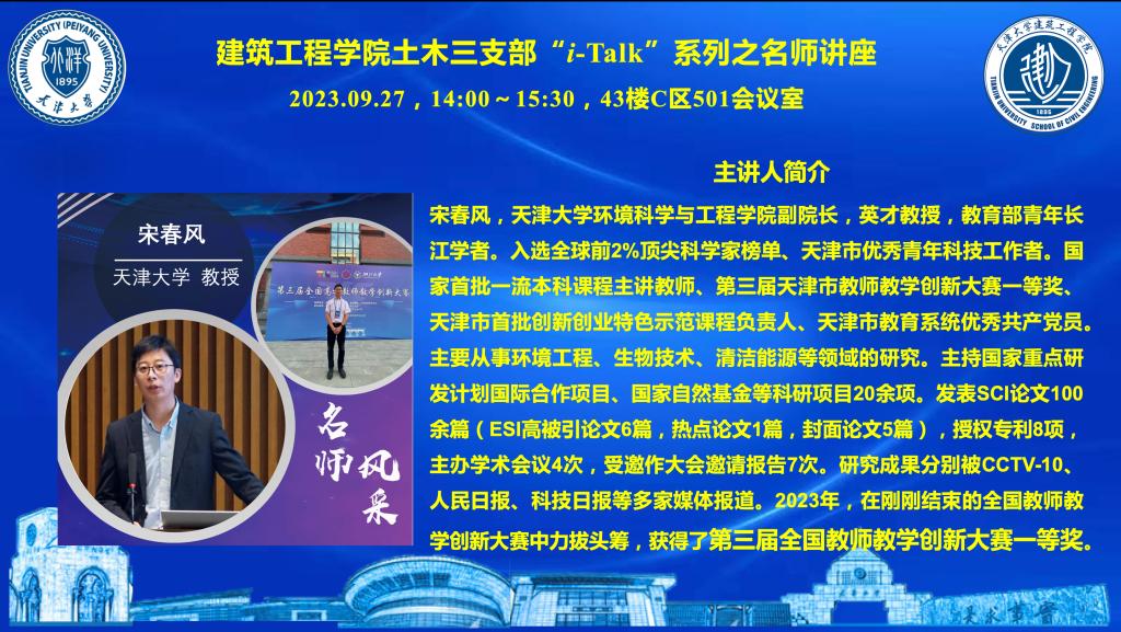 为了提升进一步提升教学质量,切实做好‘经师’和‘人师’的统一,土木三支部“i-Talk”系列之“教学明星经验交流会”于2023年9月27日成功举办。此次讲座邀请到来自九游 环境科学与工程九游 副院长,英才教授、教育部青年长江学者宋春风教授,进行题为“新工科背景下专业课程的教学创新与实践”的精彩报告。此次活动土木三支部联合土木一支部、二支部和建2021级硕士生硕士二班党支部联合开展。