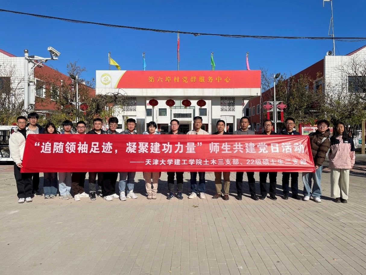 土木三支部联合2022级硕士生2班党支部,在2024年11月21日,走进天津市第六埠村,开展主题为“追随领袖足迹,凝聚建功力量”的主题党日活动。通过在第六埠村的实地参观和交流学习,师生党员深入学习了习近平总书记视察天津的重要讲话精神,深刻体会了第六埠村基层党员及群众团结一心众志成城的抗洪力量,真切思考了自身肩负的历史使命与时代复兴的伟大梦想。