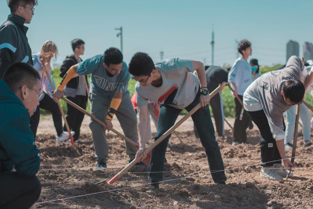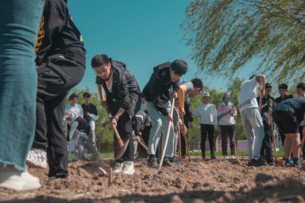 首先是要平整土地,这包括除草、翻土、填平等过程,同学们挥舞着铁锹,一铲又一铲,虽有季风阵阵拂过,可是在高强度的呼吸作用下,点点汗水还是按捺不住亲吻土地的冲动。