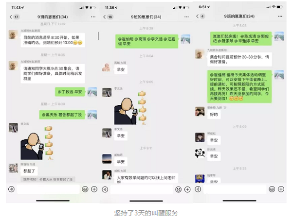 疫情期间,为了督促同学们能够早睡早起、作息规律,每天早上8点,宿舍长叫大家起床,每天晚上11点半,宿舍长提醒大家关灯休息。班主任老师每天早上随机点名问“早安”,被点到的同学群内回复“早安”;自觉做榜样,带动宿舍其他同学早起早睡、保持健康身体。