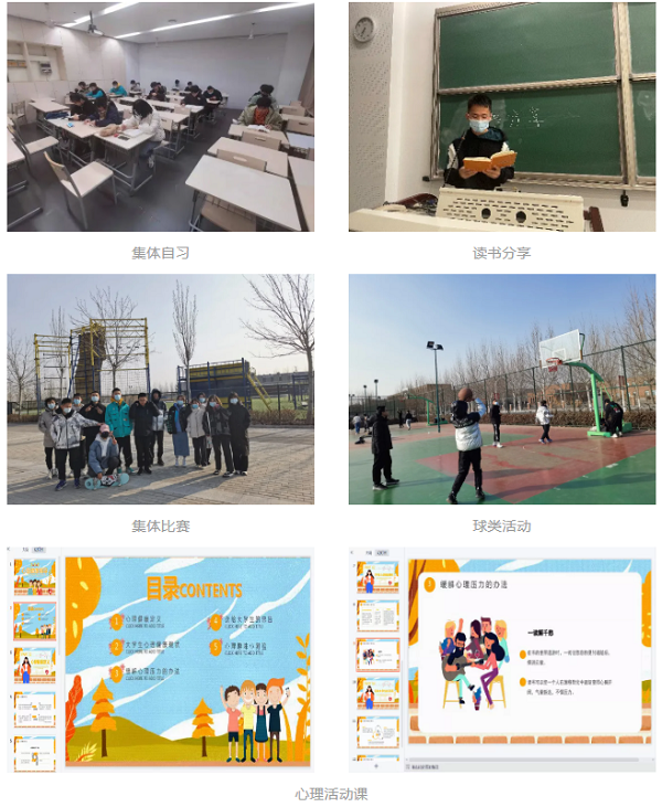 为了督促同学们走出宿舍、脱离网络、减少游戏、充分利用时间,每周一至周五由班委轮流组织2~3小时的集体活动,每天一个主题,负责人提前群内通知活动主题和时间地点,或学习,或桌游,或读书,或分享,或运动。