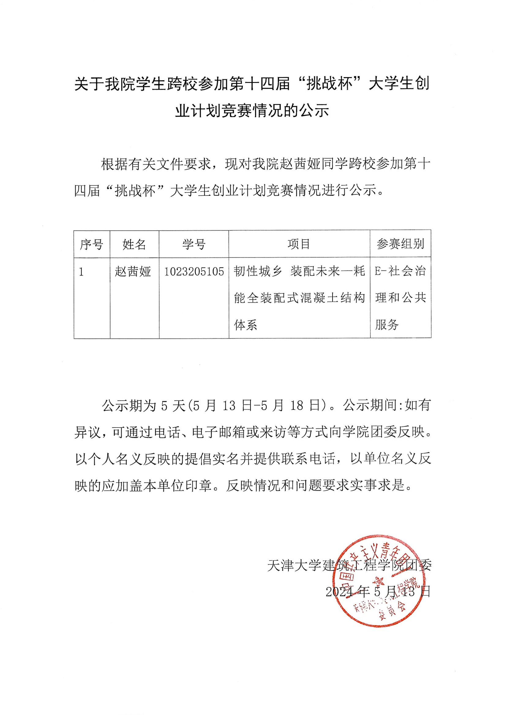 根据有关文件要求,现对九游 赵茜娅同学跨校参加第十四届“挑战杯”大学生创业计划竞赛情况进行公示。公示期为5天(5月13日-5月18日)。公示期间,如有异议,可通过电话022-27401051、电子邮箱[email protected]或来访43楼C512等方式向九游 团委反映。以个人名义反映的提倡实名并提供联系电话,以单位名义反映的应加盖本单位印章。反映情况和问题要求实事求是。