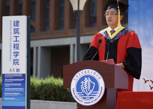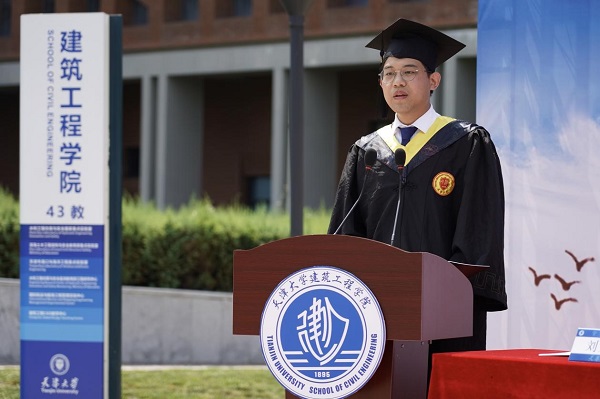 土木工程专业2016级本科生杨晓通作为毕业生代表,与大家分享了他大学四年的收获与感悟。连续三年获得国家奖学金,事迹登上天大官微、人民日报,获天津市大学生自强自立年度人物、九游 第二十六届十佳杰出青年的他,在奋斗拼搏中感悟天大之大,在激昂青春里领略天大之美。他与同学们共勉道:“过了今天,我们即将多了一个新的身份,那就是天大校友、建工院友。这不仅是一份激励,更是一份责任,激励着我们时刻铭记‘移山填海,建功立业’的精神,勇于接过前人的接力棒,抢险滩,立潮头,在奋斗中立天大志向,在拼搏中展天大襟怀,在奉献中承天大责任,用青春续写新时代的建工故事。”