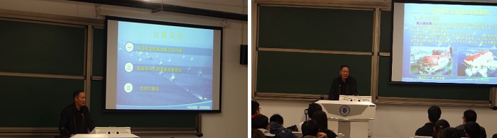 随后,李国安教授为在场同学带来了题为《关注海洋装备》的专题报告,主要分为海洋权益的基本概念和内涵、我国海洋工程装备发展情况和总结与建议三个部分。他首先介绍了10月份前往海南省三沙市的调研情况,并介绍了海洋权益和海洋资源的基本概念,为同学们展现出我国对海洋权益和主权的高度重视。然后他以我国核潜艇和“蛟龙号”深潜器为例,讲解了我国海洋工程装备的发展情况。李国安教授还强调了力学在船舶与海洋学科中的重要性,作为看家本领一定要在平时的学习中牢牢掌握、灵活运用。
