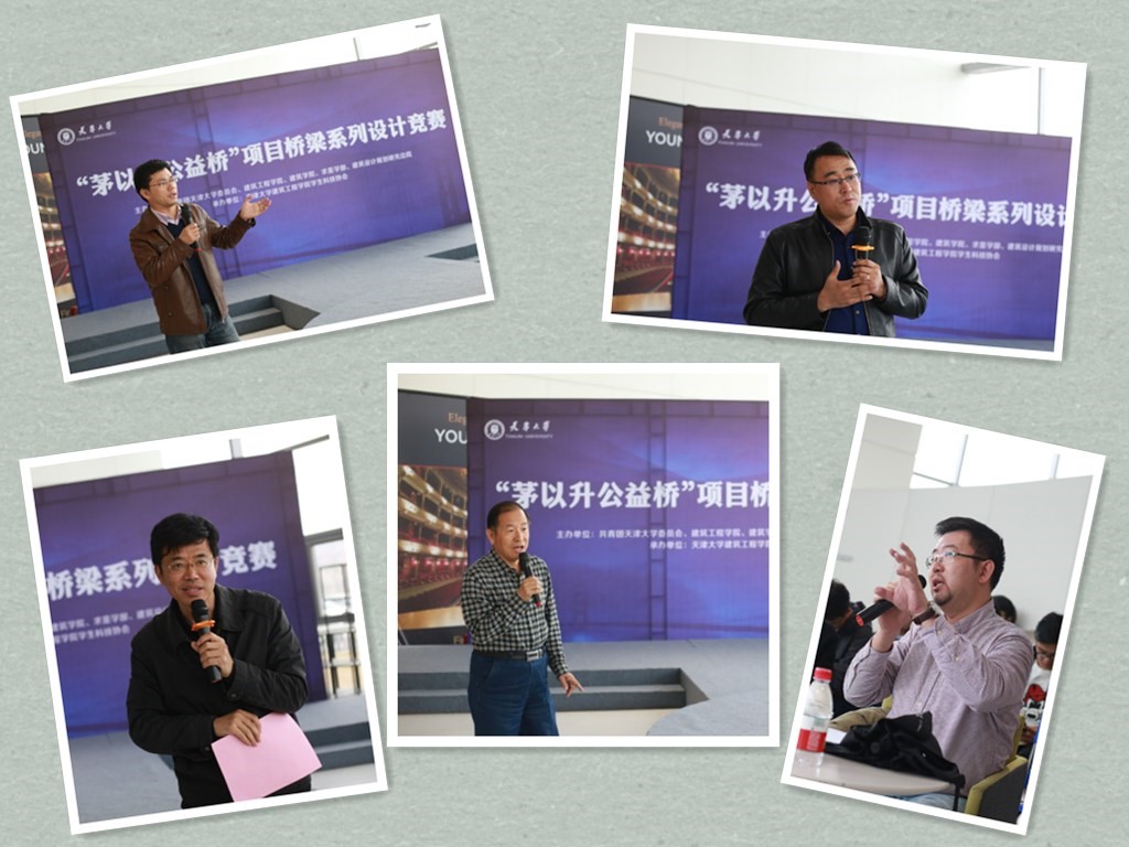 在认真听取了各组参赛选手的答辩后,各位评委老师从专业知识角度、桥梁造价经济角度等多个方面进行了提问,选手们沉着应答,巧妙化解,精彩的比赛不时博得观众们的阵阵掌声。在实体桥梁环节,丁永君、朱劲松和谢剑分别从桥梁的设计规范、经济造价、材料创新性等方面进行了点评,在肯定了大家的设计成果的同时,也给出了很多改进的意见和建议。在桥梁概念秀环节,曾鹏从“风土人情”和“科学”的结合出发,在肯定了同学们设计想法的同时,也提出了“就地取材”,增加“乡土气息”的想法和建议;罗震希望同学们能够牢记此次比赛经验,在未来继续发扬天大精神,也鼓励更多的同学能积极参与类似的活动。