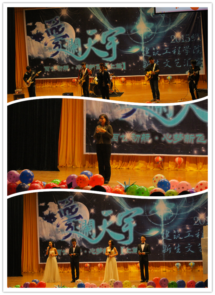 晚会伊始,团委书记张宏垚老师发表致辞,“今年天大搬迁到了新校区后,你们是第一批入住北洋园校区的学生,在这里我们的舞台更大了,设备更好了,同时也预示着我们建工学子一样能够做出更大的伟业,预祝2015级新生们能够拥有丰富精彩的大学生活”。随后,文艺汇演正式开始。