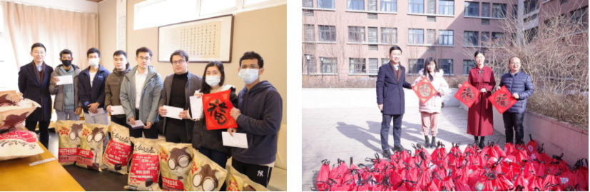 留校学生、物业及宿管人员准备了贺岁大礼包,所有留校本科生还有一份由崔鸿修奖助学金提供的新年红包。