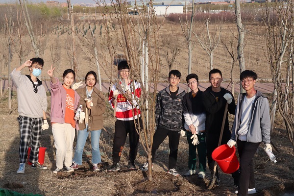 活动最后,同学们与自己种植的海棠树合影留念,并且摆出数字100的标识献礼建党百年。