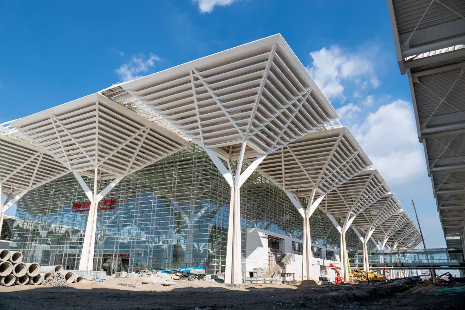 国家会展中心(天津)是商务部和天津市政府合作项目,是商务部继广州、上海之后在全国布局的第三个国家级现代化场馆,总建筑面积约138万平方米,建成后将成为我国北方地区展览面积最大的会展中心。项目分两期建设,一期工程总建设面积约80万平方米,二期约58万平方米。主要建筑包括中央大厅、16个展厅和贯通各展厅与中央大厅的交通廊等。项目主体采用钢结构,中央大厅由32个树形柱和柱间刚接钢梁组成,展厅则采用由人字形柱支撑的四弦凹形桁架结构体系,构成了宛若飞翔的“海鸥”的84米无柱空间。项目整体造型新颖独特,呈现出结构体量大、结构形式复杂、施工难度大的特点。