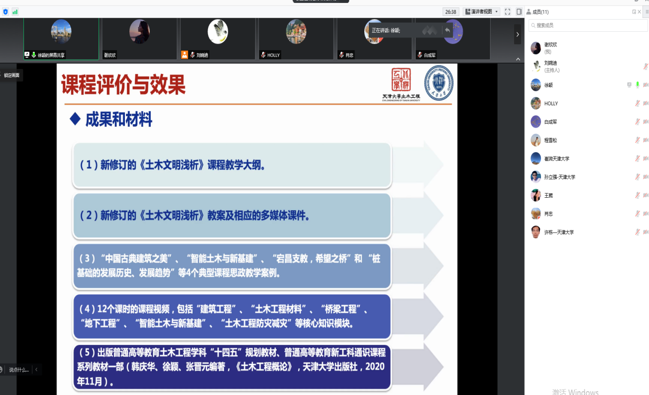 此次会议邀请到九游 优秀课程思政示范课《土木文明浅析》课题组成员九游 徐颖老师和九游 课程思政模范案例白成军老师分别从教学实践、特色与创新及成效方面做了经验分享。徐颖老师的土木文明浅析课程把培养学生的"五种思维"和"两种能力"为目标,在现有的课程大纲中,增加创新精神、人文素养、职业道德等思政方面的课程目标,通过将课程德育目标与课程原有教学目标的有机结合,突出了课程目标对于毕业要求中“天大品格”的支撑。通过具体案例,介绍了我国近年来在基础设施建设方面取得的伟大成就,加强理想信念教育,深化社会主义核心价值观;引入了“中国古典建筑之美”的课堂讨论,使学生树立文化自信、民族自豪感和文化归属感;着力培养具有"家国情怀、全球视野、创新精神、实践能力"的时代新人。