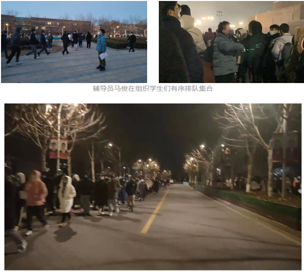 隔离在家的辅导员们和校内辅导员一起组织学生出宿舍集合,尽量不让学生多冻一分钟。