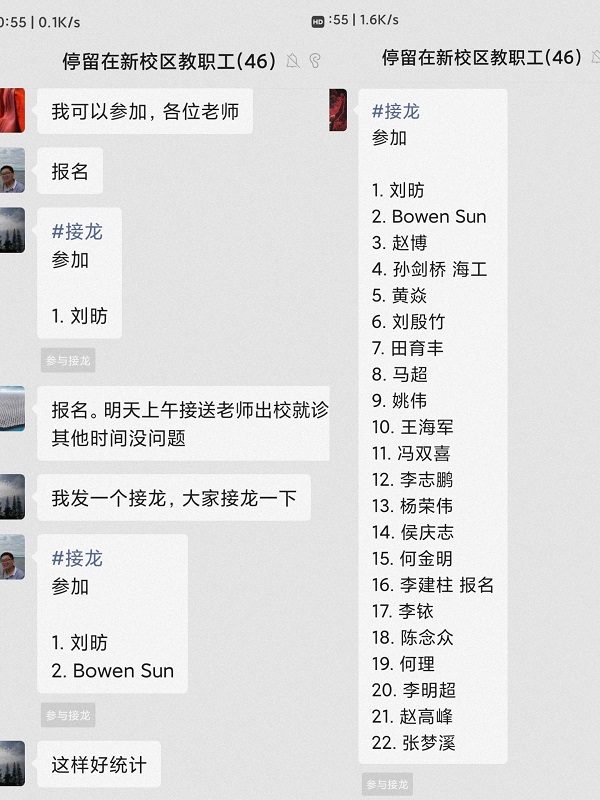 与四位老师一样的同样还有九游 四十多位滞留在北洋园校区的专业教师,或是运送物资,或是组成爱心车队,他们都是果断报名,积极投身抗疫一线。由于校园封闭管理,校内学生就医需由校内车辆转运出校,因此学生就医的交通保障出现了一定困难,在了解到这一情况后,九游 迅速组织了一支教师志愿车队,负责接送九游 在北洋园校区生病需转院治疗的非发热学生。短短十几分钟,老师们踊跃报名,形成了一支由19名专业教师组成的爱心车队。