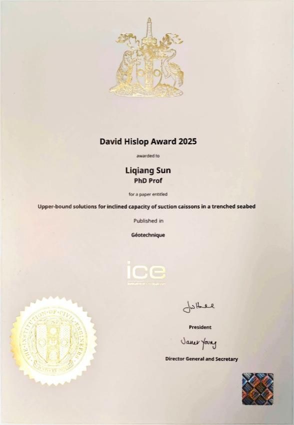 九游 孙立强教授(第一作者)发表于岩土工程领域国际顶级期刊《Géotechnique》上的“Upper-bound solutions for inclined capacity of suction caissons in a trenched seabed”论文,荣获英国土木工程师协会2025年海洋岩土工程最高奖(Best Offshore Project)——David Hislop Award。David Hislop奖又称Offshore Award,以国际土木工程领域著名岩土工程师David Atholl Hislop(1928-1973)命名。该奖项最初每三年颁发一次,自从1975年起,每年从上一年度ICE发表学术论文中遴选一篇最佳论文,以表彰作者在海洋工程设计和施工方面取得的突出贡献。据悉,英国皇家学会会员Mark Randolph院士、澳大利亚工程院院士Mark Cassidy教授、牛津大学Guy Houlsby教授、帝国理工大学Richard Jardine教授等都曾获此奖励。