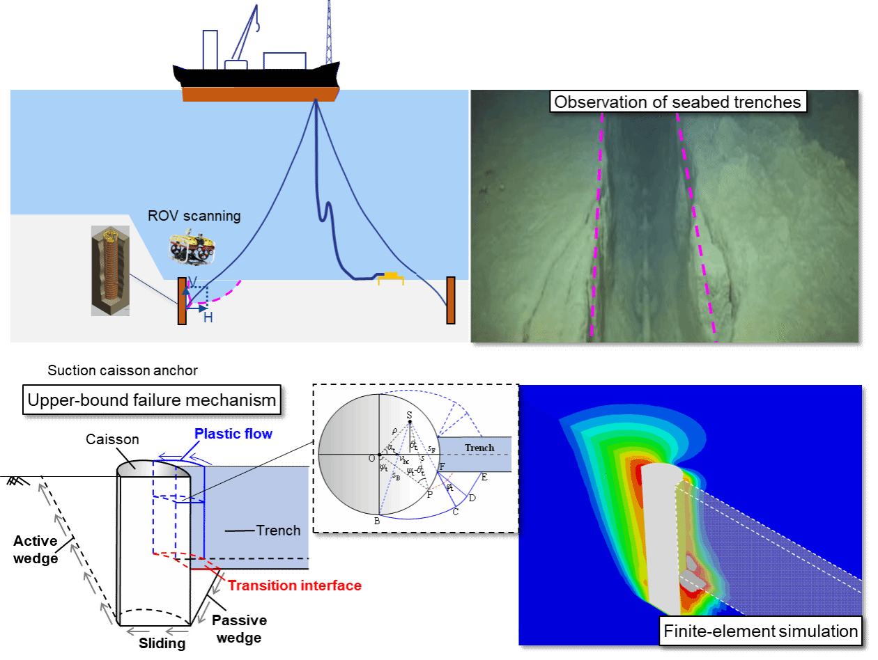 孙立强教授致力于锚固基础-地基相互作用及其承载特性方面的研究。在吸力锚服役中陆续发现了锚链切削海床形成的切削沟槽,严重危害吸力锚承载力以及系泊系统的稳定性。针对这一越发常见的工程实践挑战,在国家自然科学基金重大专项“深海土与抗拔结构界面的演化机制与分析方法”支持下,开展了吸力锚-锚链-地基相互作用研究,揭示了海底切削沟槽开展机制,阐明了海底切削沟槽条件下吸力锚承载地基破坏机制及承载特性演变规律,重点开展了切削沟槽条件下吸力锚承载力解析研究。论文创新点:(1)创新性地提出了倾斜荷载下吸力锚在完整海床及切削沟海床条件下地基破坏机制演变规律,构建了适用于切削沟槽条件下吸力锚倾斜抗拔承载力的地基破坏机构;(2)推导了各破坏机构能量耗散方程;(3)基于上限极限分析原理建立了切削沟条件下吸力锚承载力解析解。通过与数值模拟、物理模型试验结果的对比,验证了文中提出的上限解决方案是一种可靠、高效的设计工具,可用于评估海底沟槽对吸力锚承载能力的影响。