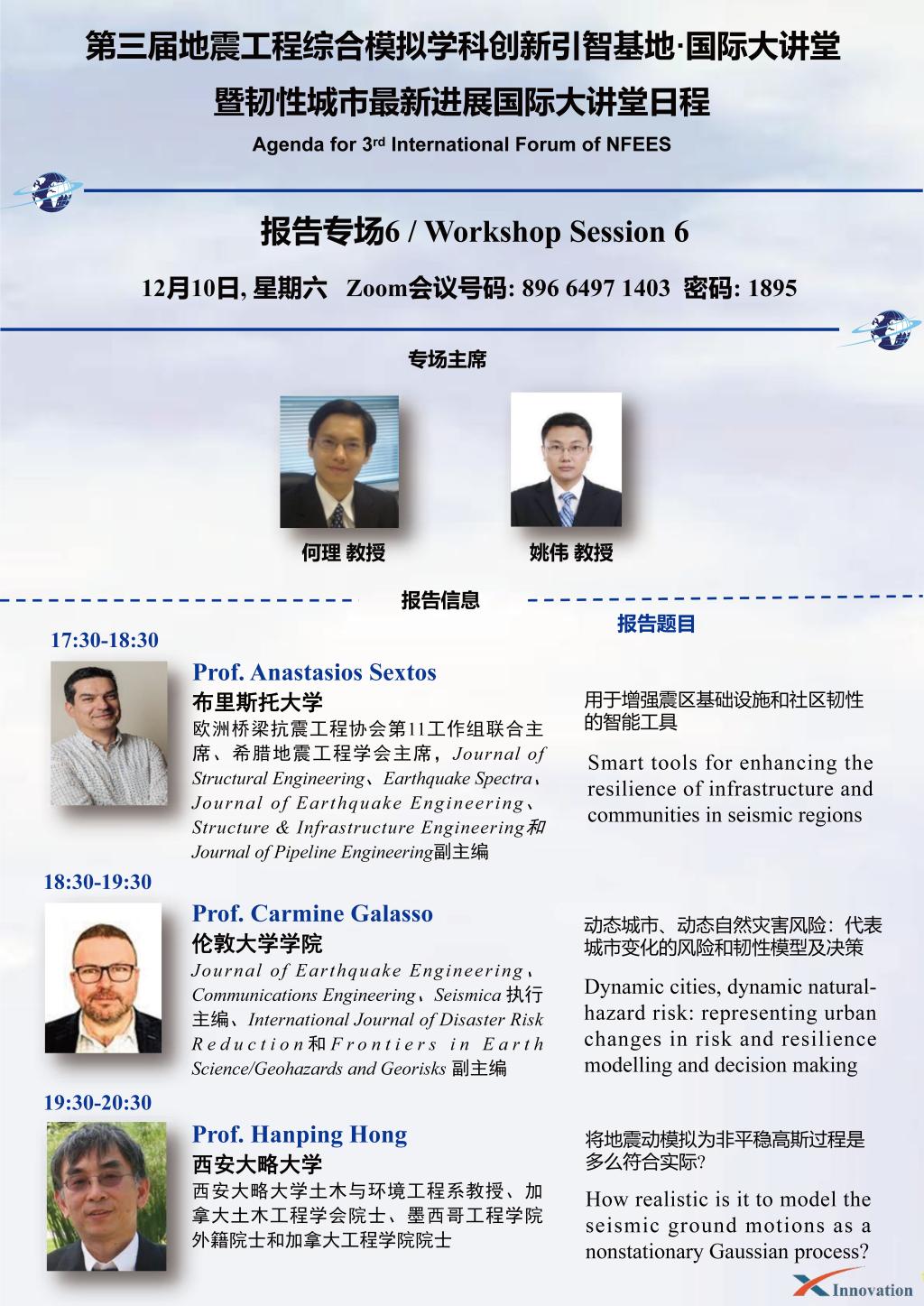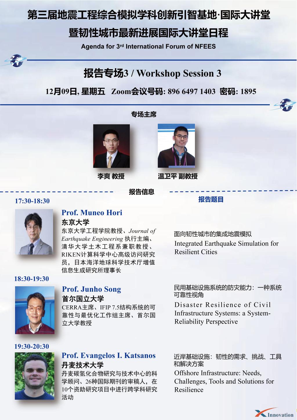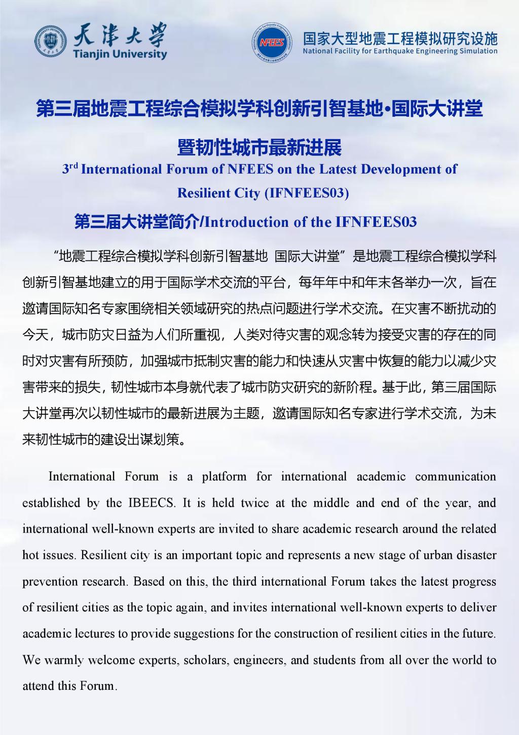 “地震工程综合模拟学科创新引智基地·国际大讲堂”是地震工程综合模拟学科创新引智基地建立的用于国际学术交流的平台,每年年中和年末各举办一次,旨在邀请国际知名专家围绕相关领域研究的热点问题进行学术交流。在灾害不断扰动的今天,城市防灾日益为人们所重视,人类对待灾害的观念转为接受灾害的存在的同时对灾害有所预防,加强城市抵制灾害的能力和快速从灾害中恢复的能力以减少灾害带来的损失,韧性城市本身就代表了城市防灾研究的新阶程。基于此,第三届国际大讲堂再次以韧性城市的最新进展为主题,邀请国际知名专家进行学术交流,为未来韧性城市的建设出谋划策。