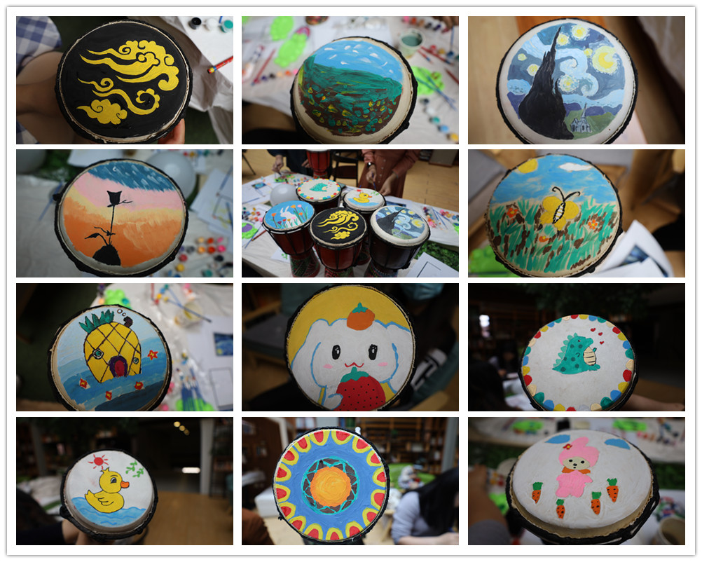 非洲鼓是一种徒手演奏乐器,节奏感强、富有感染力。活动过程中,大家在指导老师的讲解下,充分发挥自己的想象力,或可爱、或大气、或婉约、或形象……,在鼓面上用简单的线条和明亮的色彩,勾勒出别具一格的图案,制作出专属自己的乐器。