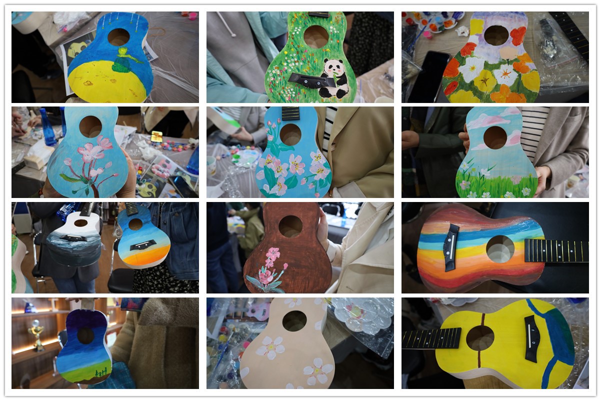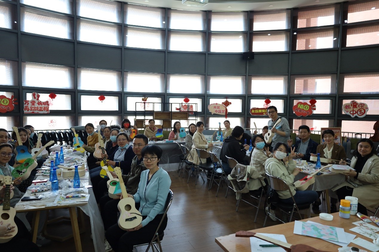 随后,老师们来到43楼二层山海厅,共同观看了“多彩之日”启动仪式直播;在悠扬的尤克里里乐曲中,感受音乐的魅力,了解尤克里里基础知识;在专业老师的指导下,调色、勾线稿、涂色,将春日海棠定格笔下,将慧心巧思融入设计中,创造出个人特色鲜明的专属乐器。