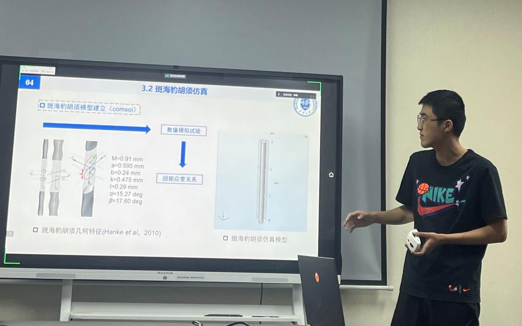 中期答辩会议上,水动力研究小组基于斑海豹胡须和机器鱼精细化几何模型,开展斑海豹胡须涡激振动的物理模型实验与数值模拟,分析不同柱体-柱体直径、不同来流攻角、不同流速等条件对胡须模型振动响应的影响,为进一步开展基于数据驱动和机器学习的斑海豹胡须感知机理研究提供高质量的数据基础。
