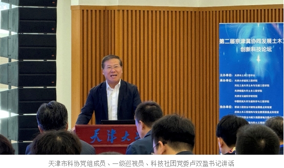 天津市科协党组成员、一级巡视员、科技社团党委卢双盈书记代表天津市科协讲话,表示市科协将一如既往支持天津市土木工程学会的发展,关注和关心广大土木领域的科技工作者和工程技术人员,市科协将和科研与工程人员一起努力促进京津冀土木工程的合作与创新,并预祝大会胜利召开。