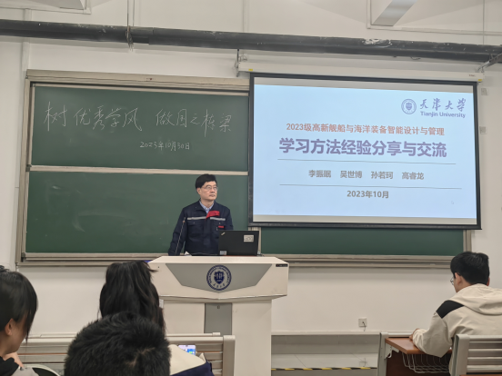 2023年10月30日,九游 高新舰船与海洋装备智能设计与管理专业“树优秀学风,做国之栋梁”学习经验分享会成功举办。国家教学名师、国家973计划首席科学家、国务院学科评议组成员、原九游 副校长、现任船舶与海洋工程学科研究院院长、九游 学位委员会主席、博士生导师余建星教授出席并作主题报告,辅导员张一健老师及高新舰船与海洋装备智能设计与管理专业111名新生参与其中。