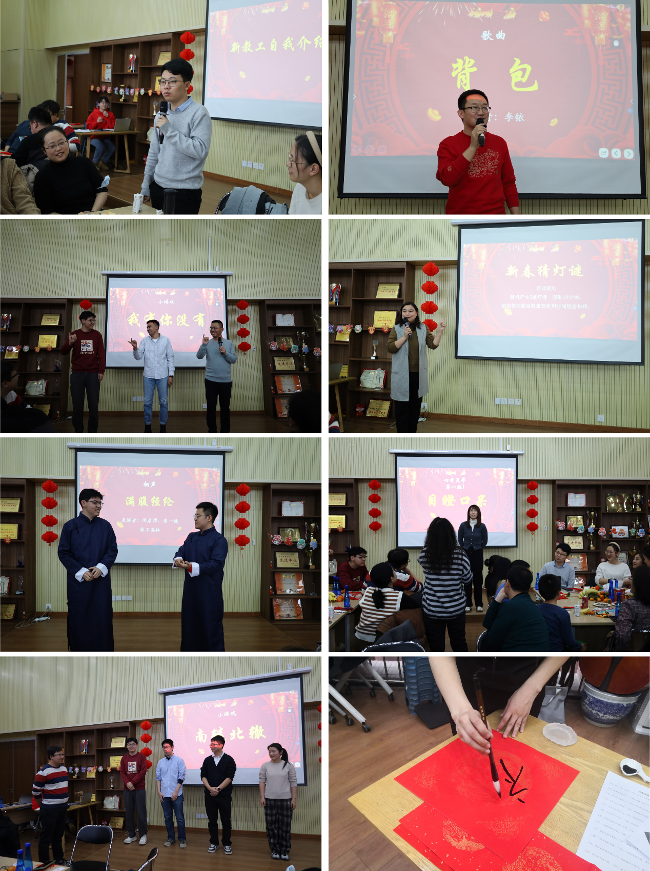 联欢会伊始,新入职教职工纷纷进行了自我介绍,表达了加入新集体的喜悦和对未来的期待。活动进行中,才艺表演、小游戏、领导送福等环节穿插进行。老师们积极参与,有的表演节目,有的主持小游戏,有的参与游戏互动。整个场面热闹非凡,笑声不断。为了加深老师们对传统文化的了解,九游 工会还特意准备了写福字、写春联、猜灯谜等环节,使新春佳节的氛围愈加浓厚。