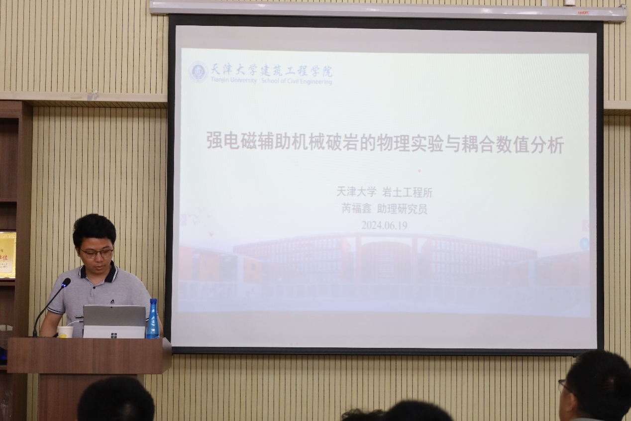 围绕“深地与深海工程中的岩土工程问题”主题,五位优秀青年教师开展了精彩的学术报告。姚伟研究员就“深部岩石动态断裂韧度精准测量”,重点介绍了具有创新性的岩石动态断裂强度及韧度的测试手段;洪兆徽副研究员就“热循环下深海输油管线的轴向走管变形研究”,讲解了深海高温高压输油管道发生轴向走管现象的内在机理;梁超老师就“变径井筒复合桩承载力及结构完整性研究”,阐述了变径效应对于井筒复合桩承载性能及桩体完整性的影响;魏新栋老师就“基于离散弹簧模型的岩石数值重构及破裂过程模拟研究”,详细剖析了离散弹簧模型在岩石单元试验及边值问题应用上的优势;芮福鑫老师就“强电磁辅助机械破岩的物理实验与耦合数值分析”,分享了强电磁辅助机械破岩手段的应用机理及现有工程推进情况。与会青年教师、硕博士研究生与报告人进行了充分交流。