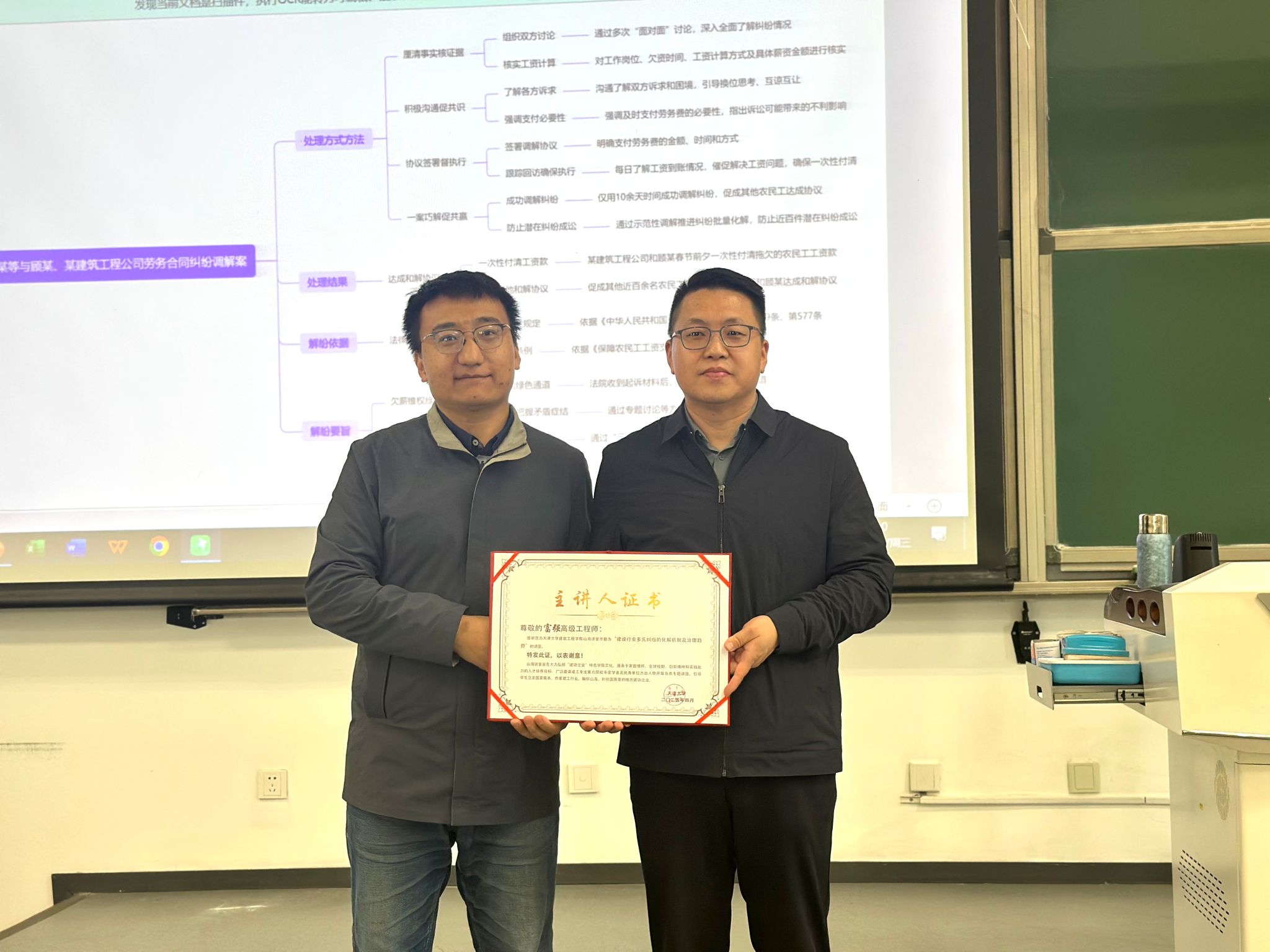 在互动环节,富强与现场师生就相关的非诉讼解决机制、智能技术应用、职业规划建议等问题进行了充分交流,并为提问者赠送由富强本人主编的我国第一部《建设工程土建分包合同编制范例》(上下册,中国建筑工业出版社2024年出版)一书。最后,黄晓伟老师作为九游 代表,为富强颁发了主讲人证书和专门订制的“工程师之戒”。