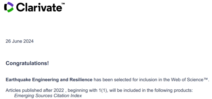 2024年6月27日,Earthquake Engineering and Resilience(简称EER,《地震工程与韧性》)顺利通过了科睿唯安(Clarivate Analytics)的评估,正式被Emerging Sources Citation Index(以下简称ESCI)数据库收录。期刊自创刊起全部文章均会被Web of Science追溯收录,并将于2025年获得首个影响因子。